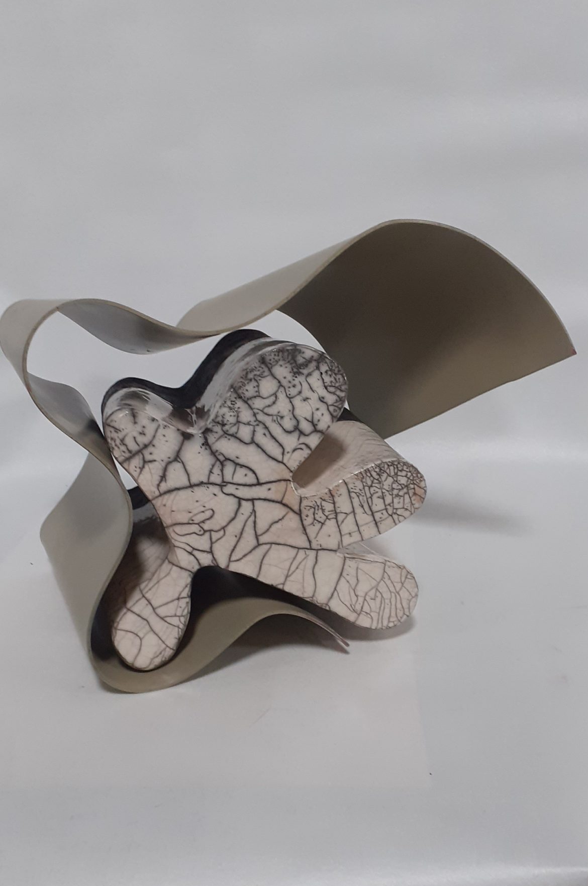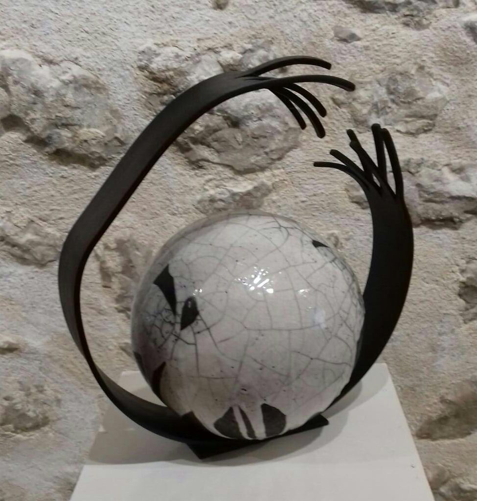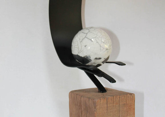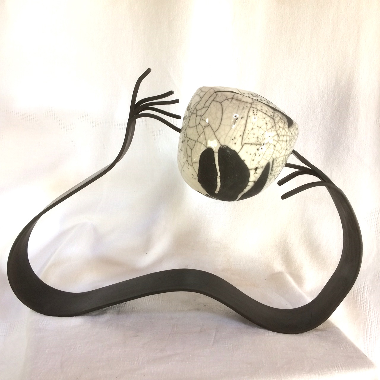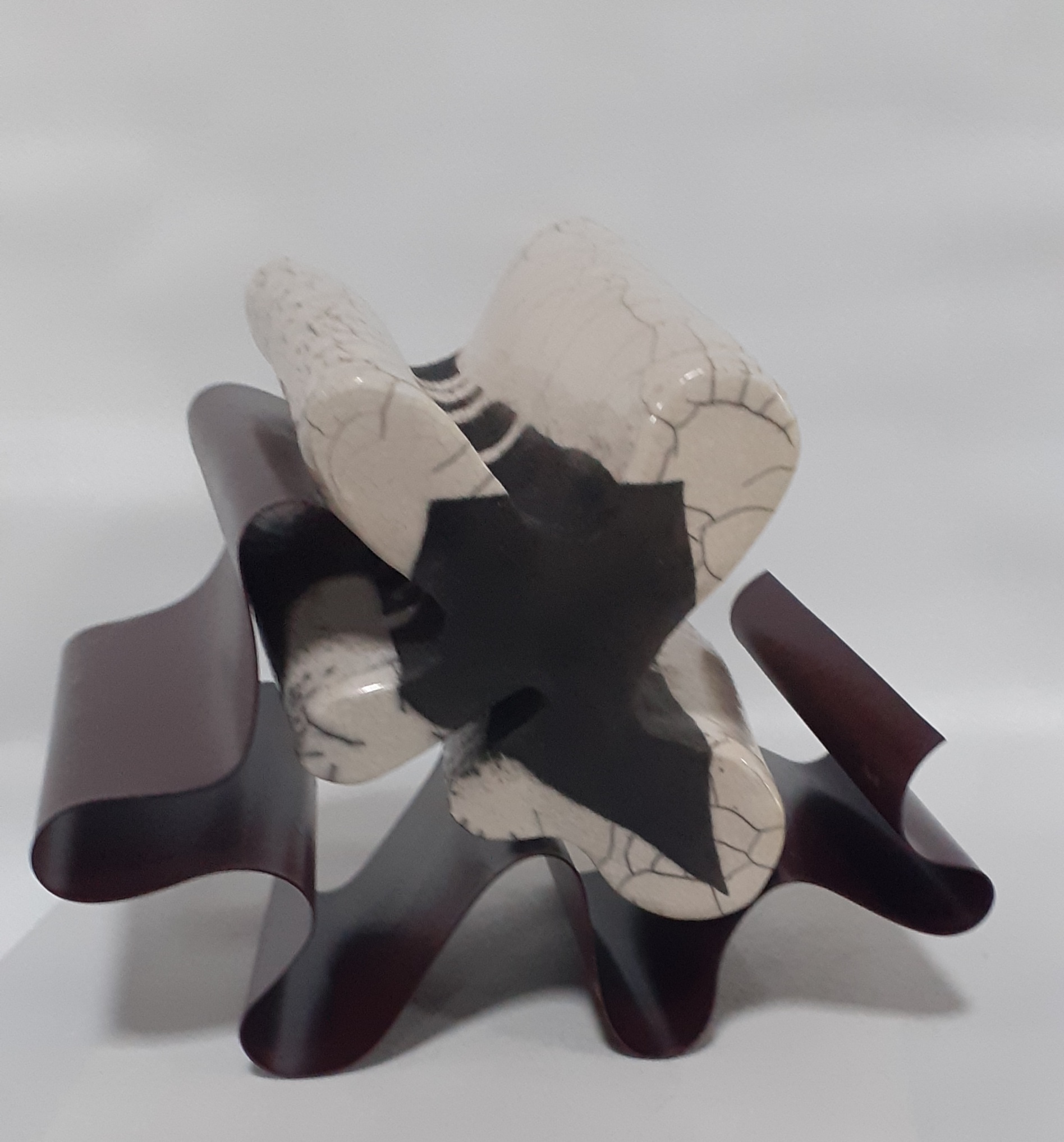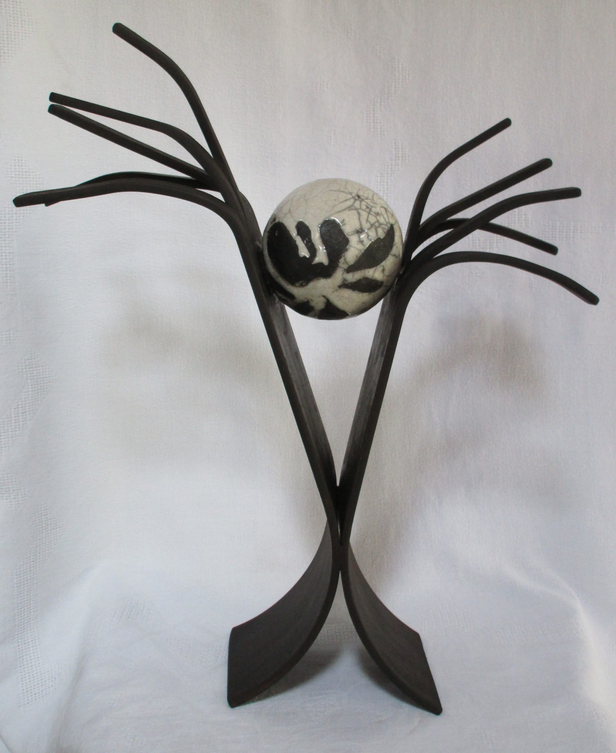 L’association du raku aux sculptures métal vient de mon désir de fusionner le métal et le minéral. Cette terre émaillée incarne l’esthétique fondée sur le dépouillement.